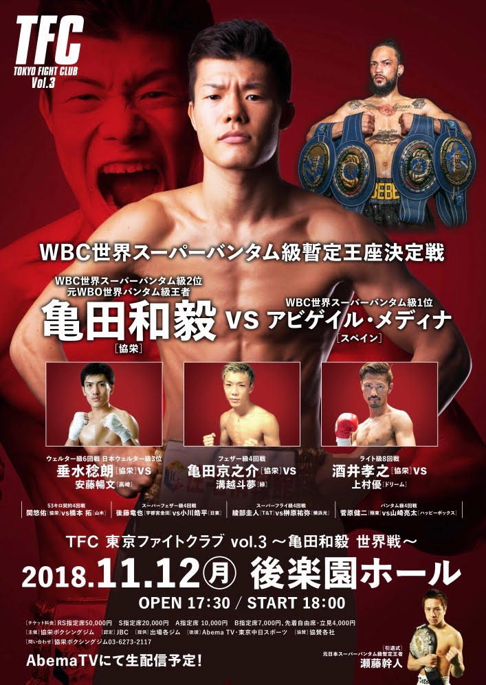 TOP > NEWS > 【当日券販売情報】 11月12日(月)後楽園ホール『TFC vol.3 ~亀田和毅 世界戦~』