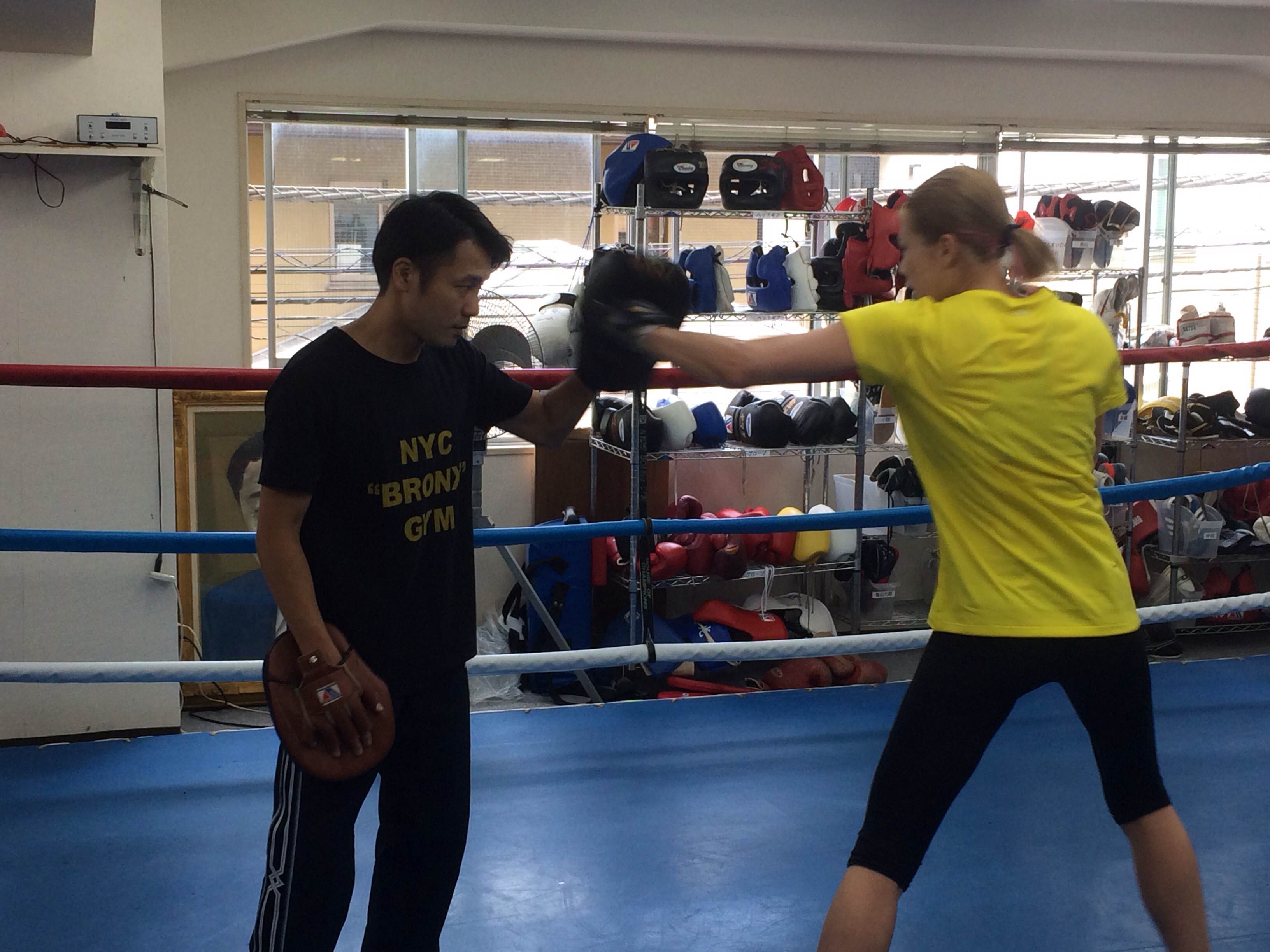 練習内容は坂田代表によるミット打ち、サンドバッグ打ち。坂田代表の言葉通り左ジャブからの右ストレートを入念にチェックしていた。